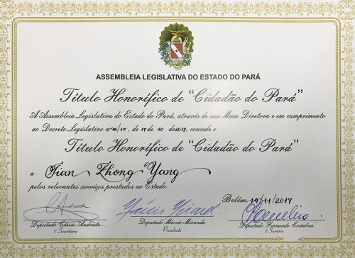 帕拉州議會(huì)于2017年10月17日通過(guò)立法大會(huì)17年第96條法令,授予楊建忠先生“帕拉州榮譽(yù)公民”稱(chēng)號(hào)(鑒于對(duì)帕拉州所做出的貢獻(xiàn))。