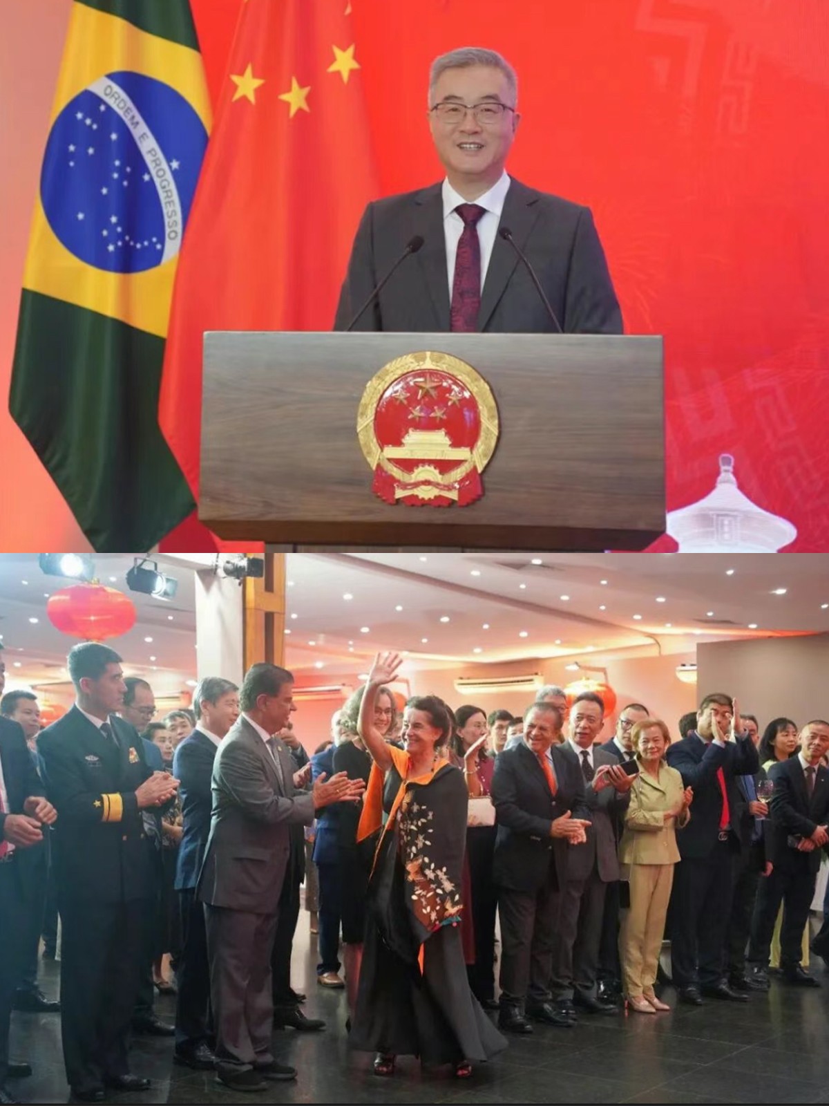 參加春節(jié)招待會的有巴西衛(wèi)生部部長帕迪利亞、外交部副部長克萊班克、科技創(chuàng)新部副部長阿爾梅達、體育部副部長洛科、參議院巴中友好小組主席特拉德、國會巴中議員陣線主席皮納托、吉馬良斯·羅莎研究所所長納卡塔等政要,巴西電視劇《女奴》主演盧塞莉亞女士等巴文化界名流及各界友好人士,以及駐巴使團,旅巴華僑華人、在巴中資機構(gòu)和孔子學院代表等近300人出席。